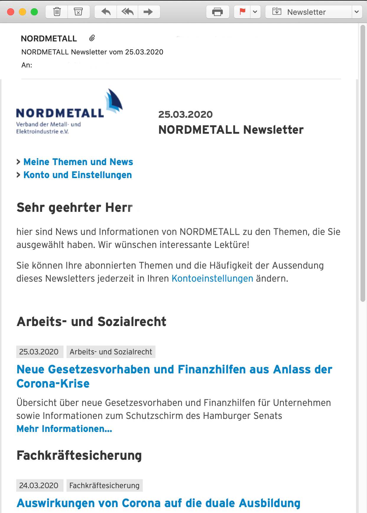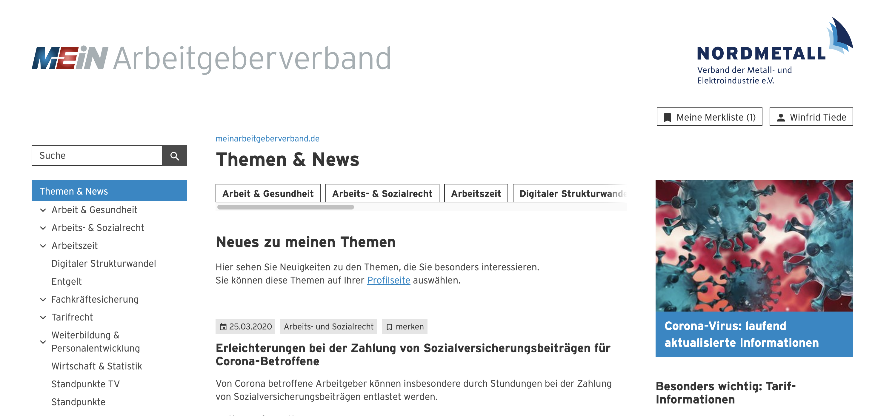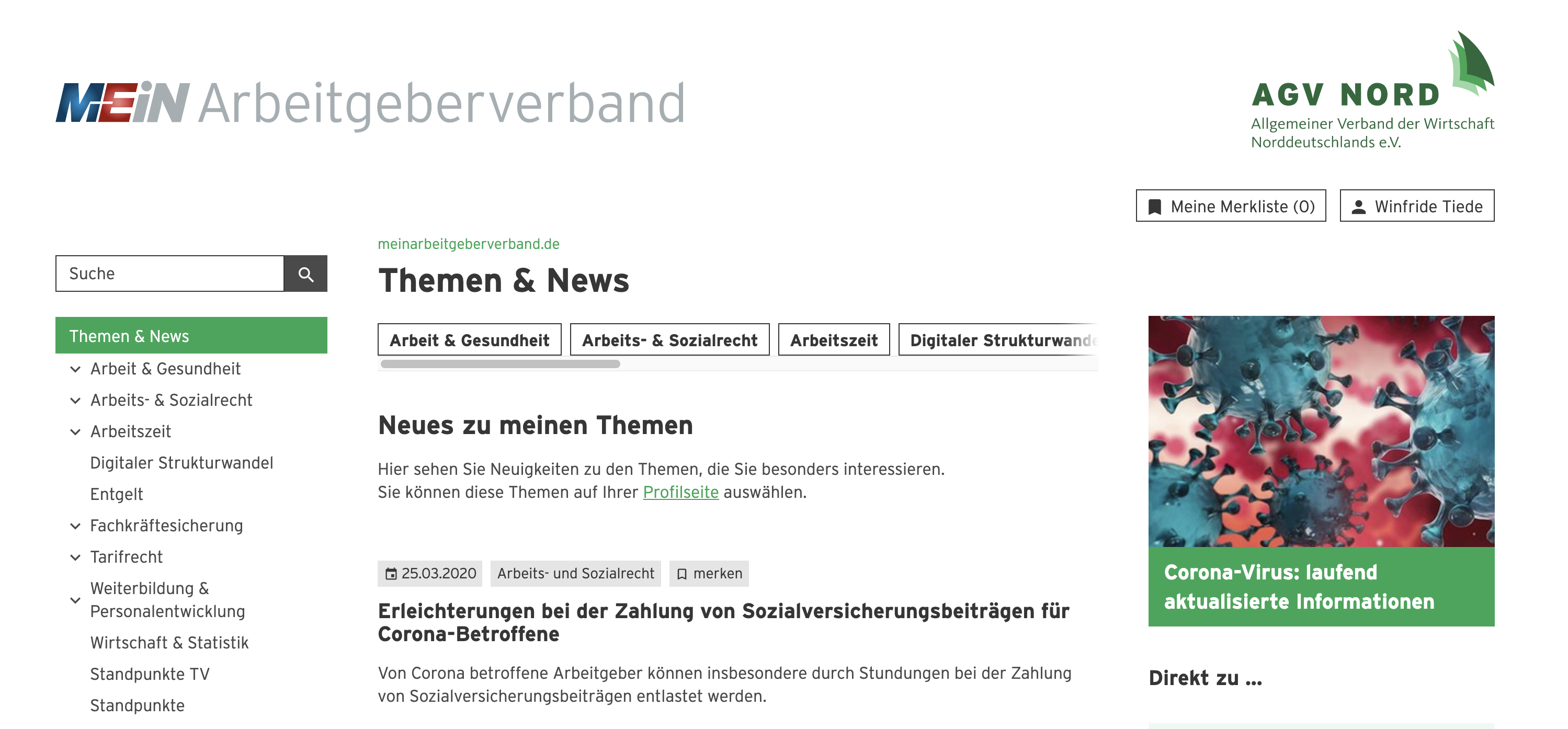 Auch die registrierten Mitarbeiter der Mitgliedsunternehmen wurden aus der alten Website übernommen. Eingeloggte Nutzer finden sich in den Inhalten und der Farbwelt Ihres Verbandes (also NORDMETALL oder AGV-NORD) wieder. Die Nutzer haben jetzt die Möglichkeit, Themen zu abonnieren: d.h. sie sehen vorzugsweise nur die News-Artikel, die zu ihrem Fachbereich gehören.