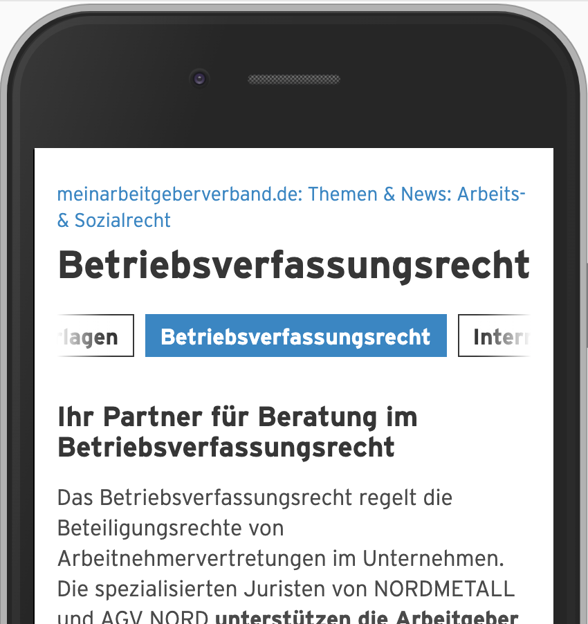 Die Verbände hatten vor dem Relaunch zwei Websites auf TYPO3-Basis, die in vielen Teilen gleich waren – aber in einigen Teilen auch unterschiedlich (Farbe, Layout und natürlich Inhalte). Unsere Aufgabe bestand darin, gemeinsam mit den Verbänden eine Website zu entwickeln, die für normale Besucher eine Website beider Verbände unter dem Dach "MeinArbeitgeberverband.de" ist – und für die registrierten Nutzer der Mitglieder von NORDMETALL und AGV NORD speziell zugeschnittene Inhalte bereitstellt.