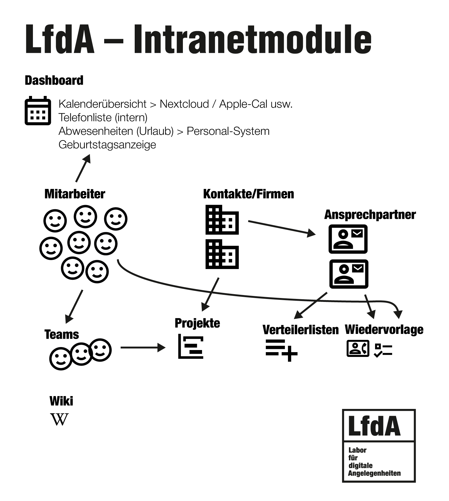 LfdA verfügt über einen kleinen aber feinen Werkzeugkasten zur Gestaltung individueller Intranets. Die Backendtechnologie basiert auf dem Django Framework, das Frontend ist responsive und läuft in jedem modernen Internetbrowser.